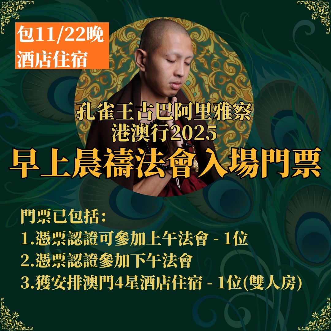 孔雀王古巴阿里雅察港澳法會2025 [孔雀王港澳行2025] 晨禱法會門票+澳門酒店住宿(1位) 固定價格 [孔雀王港澳行2025]晨禱法會門票(1位) 固定價格 [孔雀王港澳行2025]下午公眾法會經繩(1條) 固定價格 [孔雀王港澳行2025]港澳法會限定聖物(金) 固定價格 [孔雀王港澳行2025]港澳法會限定聖物(銀) 固定價格 孔雀明華圍巾