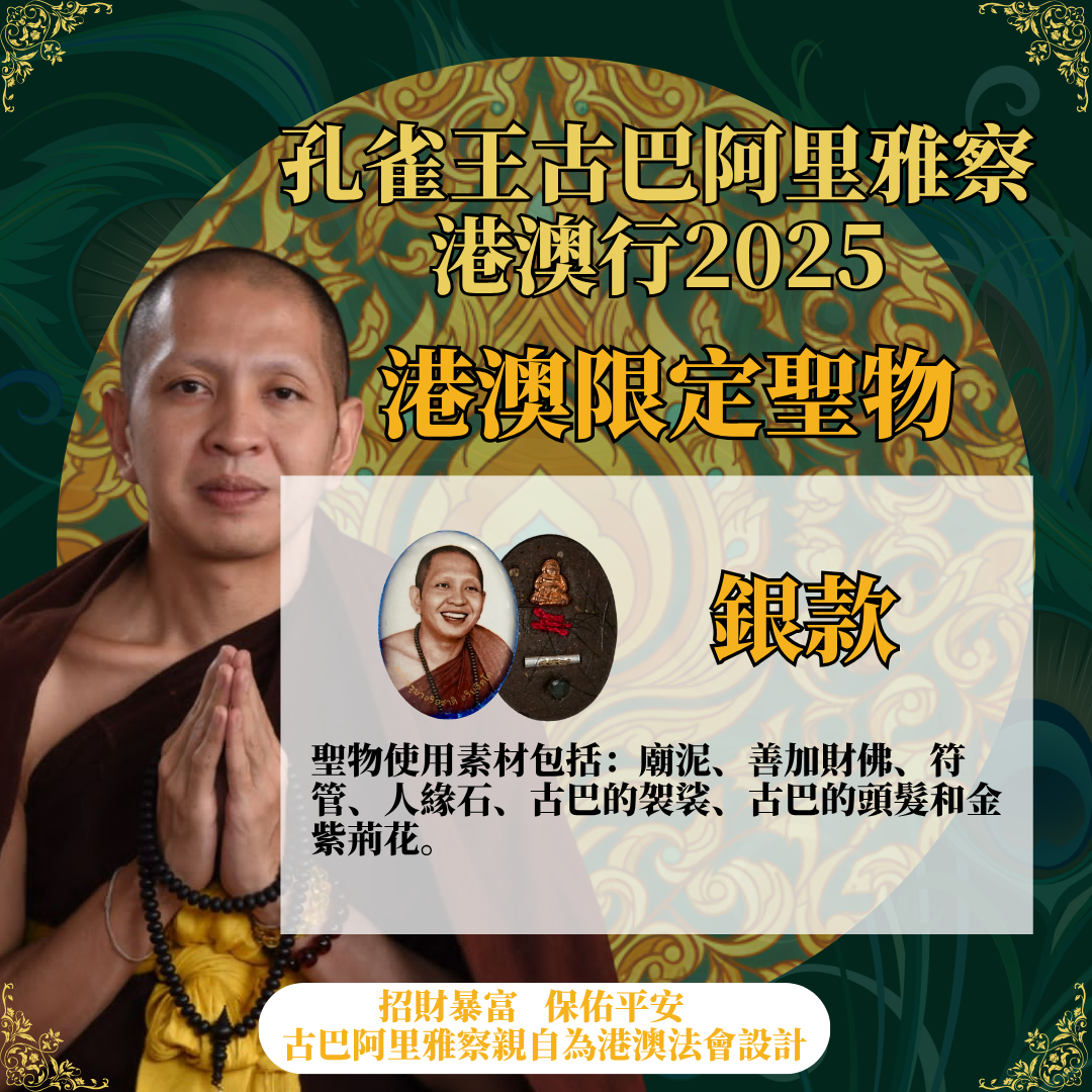 古巴在 2024 年自己生日的一日特別為香港舉辦法會而創作「港澳法會限定聖物」,全港只在阿贊Caca的孔雀王古巴阿里雅察招財女神香港禪寺恭請。聖物正面為古巴阿里雅察肖像,背面則以廟泥作基底,首先以善加財佛及金銀符管作加持護佑,突顯孔雀王知名的法門「招財暴富」,再加入人緣石、古巴自己的袈裟和頭髮等不同素材製作,為配戴者保佑平安和招來財富,最後還有一種相當有趣素材,就是金屬製作的金紫荊花,絕對是香港佛牌界獨有,精準為香港人而度身訂做。 港澳法會限定聖物設有金銀、金、銀三款,三款所有用料都一樣,唯一不同的地方是在港澳法會限定聖物(金銀)和(金)內的金符管內使用的是真金,港澳法會限定聖物(銀)則使用銀符管製作。每款聖物恭請時都可以選擇包殼,將聖物製作成項鍊或吊飾,附加費為$100 。 #孔雀王港澳行2025 #孔雀王港澳法會 #古巴阿里雅察